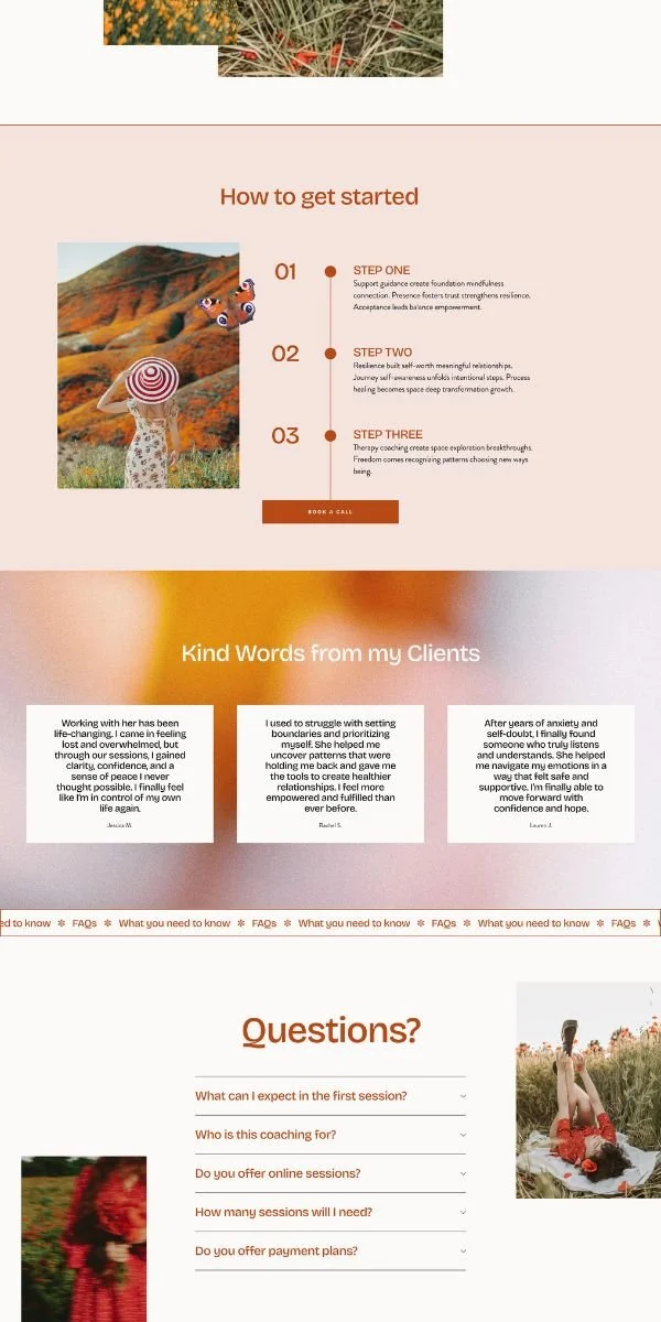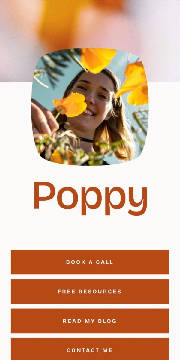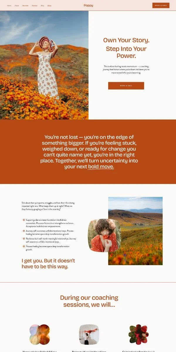 Poppy is perfect for coaches, therapists, creatives, personal brands, and service-based entrepreneurs who want a bold, modern website that expresses personality while still feeling clean and professional. Whether you're a life coach, mindset mentor, wellness practitioner, or content creator — this template has you covered.